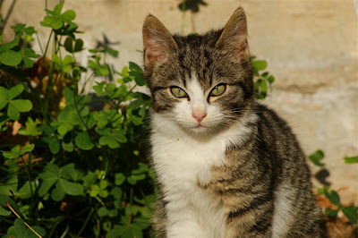 В то утро лил проливной дождь, на улице было сыро и противно… И кто-то очень громко и требовательно мяукал… Убедившись, что все 6 наших котов на месте, пошла в сад искать, кто пищит, и нашла мужа, который с очень хитрой мордой лица кидал кусочки сдобной булочки куда-то за кадку с бугенвилеей. После каждого броска оттуда раздавалось рычание, чавканье и пение одновременно:)